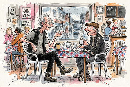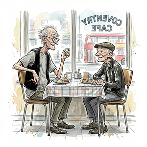 The Greasy Spoon is a small, stubborn café in Coventry, England where the coffee is strong, the fry-ups are heroic, and reality is a bit undercooked. Joe and Bob sit at their usual table, talking rubbish, dodging responsibility and occasionally stumbling into moments of accidental wisdom. These are their ongoing misadventures: working‑class, sweary, and just about held together with bacon grease and coffee.